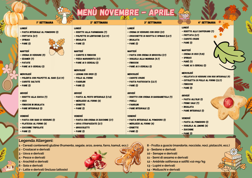 Menu novembre – aprile 2025Il menù novembre-aprile andrà in vigore da lunedì 3 novembre dalla prima settimana. Potete trovarlo qui